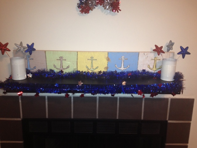 I have not done a mantel post in a long time. The spring decor was very little (just a couple fake flowers) so for the summer months and the 4th of July I knew I needed to spruce it up a bit. I already had the 2 white soup cans from the winter mantel and Ryan's art work. So the rest of the decor came from the dollar store and The Christmas Tree Shop.